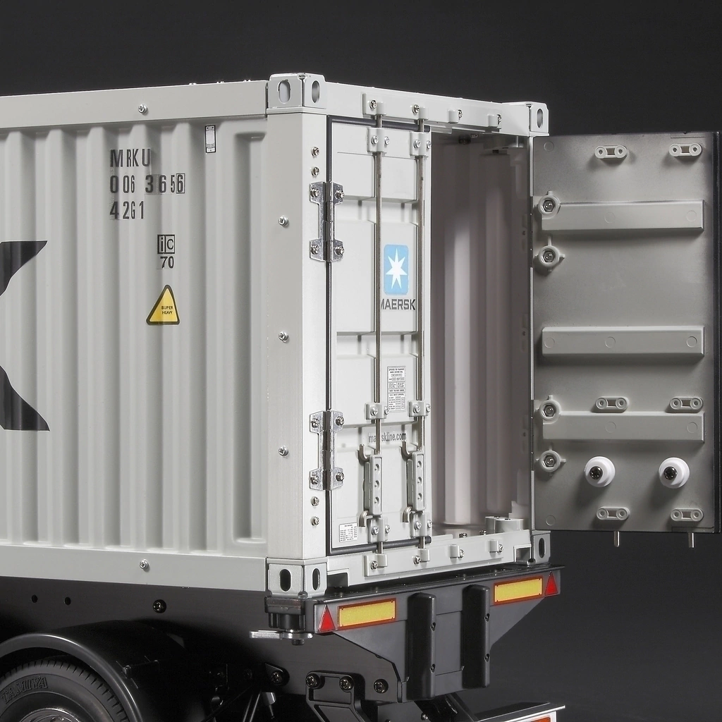 Os contêineres de carga são essenciais para a logística moderna e são usados para o envio de produtos e matérias-primas ao redor do mundo. A Tamiya está orgulhosa em adicionar este Semi-Reboque de Contêiner de 40 Pés à linha de Trens Truck Series da escala 1/14. O contêiner possui uma estrutura de alumínio com painéis frontais, superiores e laterais de ABS duráveis que possuem padrões de painel distintos. Os logotipos amplamente reconhecidos da Maersk podem ser representados com a folha de adesivos incluída, e o contêiner pode ser retirado do semi-reboque após a montagem. O chassi do semi-reboque de 3 eixos vem com uma suspensão de mola folheada realisticamente reproduzida. Este semi-reboque pode ser conectado a qualquer Caminhão Trator Tamiya 1/14 R / C e uma variedade de Opcionais também pode ser instalada para um realismo ainda maior.