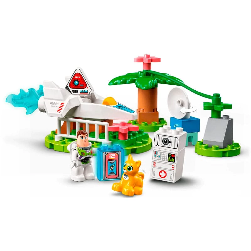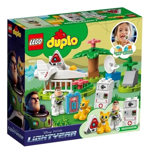 Leve a imaginação das crianças para o espaço com LEGO® DUPLO® Disney e Pixar Missão Planetária de Buzz Lightyear (10962) - um set para brincadeira de desenvolvimento para idade pré-escolar de 2 anos ou mais. Brincadeira sem limites com o icónico ranger do espaço Os fãs do filme Lightyear da Disney e Pixar e do próprio ranger do espaço icónico vão gostar de ajudar Buzz e os seus 3 amigos - Sox, o gato robô, Ivan, o computador, e Eric, o droide triangular, a encontrar a célula de combustível desaparecida da sua nave espacial. Procuram a caverna com a porta de abertura, exploram a selva com a sua trepadeira escalável e verificam a estação de radar com a sua placa giratória para encontrar a célula de combustível, depois lançam-se em aventuras intermináveis na nave espacial do Buzz. Este brinquedo de construção incentiva a criatividade e a imaginação das crianças em idade pré-escolar e ensina-as sobre o trabalho de equipa e as maravilhas do espaço. Aprendizagem divertida Os pais podem partilhar marcos de desenvolvimento preciosos, com os brinquedos LEGO DUPLO a proporcionarem diversão ilimitada, autoexpressão e exploração feliz aos mais jovens.