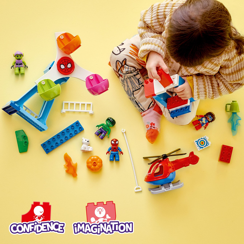 Os super-heróis a partir de 2 anos irão adorar explorar atividades práticas e brincadeira criativa com LEGO® DUPLO® Marvel Homem-Aranha e Amigos: Parque de Diversões (10963). Aventuras com Super-Heróis para pré-escolares Este brinquedo de desenvolvimento para construir e brincar oferece uma introdução ideal ao mundo da Marvel Super Heroes. Os jovens fãs da série de TV da Marvel no canal Disney+ Homem-Aranha e seus Incríveis Amigos vão reconhecer estas 4 figuras DUPLO incluídas neste versátilconjunto: Homem- Aranha, Hulk, Ms. Marvel e Duende Verde. As crianças podem levar as personagens para um passeio na roda gigante giratória, lançar bombas de abóbora flamejantes, brincar com um disparador de água e pilotar um helicóptero com rotores giratórios, desenvolvendo habilidades essenciais enquanto embarcam em aventuras imaginativas de Super-Heróis. Aprendizagem divertida para bebês Os pais podem compartilhar marcos preciosos de desenvolvimento, pois os brinquedos para construir LEGODUPLO colocam nas mãos das crianças diversão ilimitada, autoexpressão e exploração alegre.