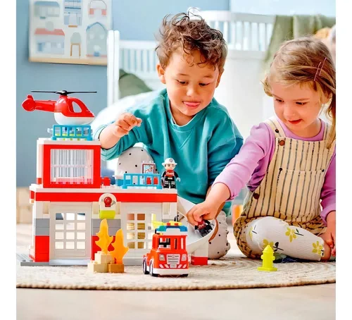 A equipe de combate a incêndios desce rapidamente o escorregador, entra no caminhão dos bombeiros Push&Go e sai pela grande porta de vaivém, com as luzes piscando e a sirene soando (baterias incluídas). Um helicóptero decola do telhado para se juntarà missão. Quando a ação acabar, é hora do treino de combate a incêndio, uma merecida pizza e depois hora de dormir - prontos para outro dia agitado amanhã. Projetado especialmente para crianças em idade pré-escolar, o conjunto está repleto de possibilidades de brincadeiras de desenvolvimento que melhoram as capacidades motoras finas, consciência emocional e muito mais. É também uma maneira despreocupada de aprenderem sobre o trabalho dos bombeiros.