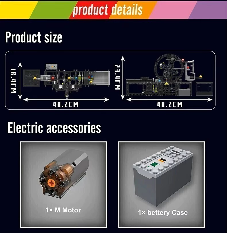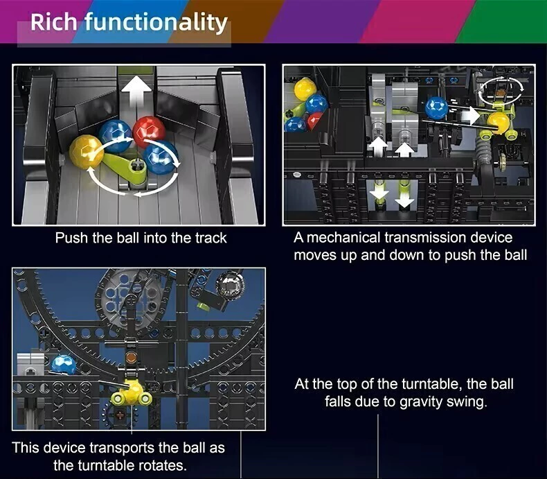 O Mould King 26015 – GBC Planetray Lift é um conjunto avançado de blocos de montar que reproduz um incrível sistema de transporte de esferas com engrenagens planetárias. Seu mecanismo linear garante movimentos suaves, enquanto o alimentador rotativo e o portão oscilante trabalham em perfeita sincronia para conduzir as bolas por diferentes níveis do circuito.